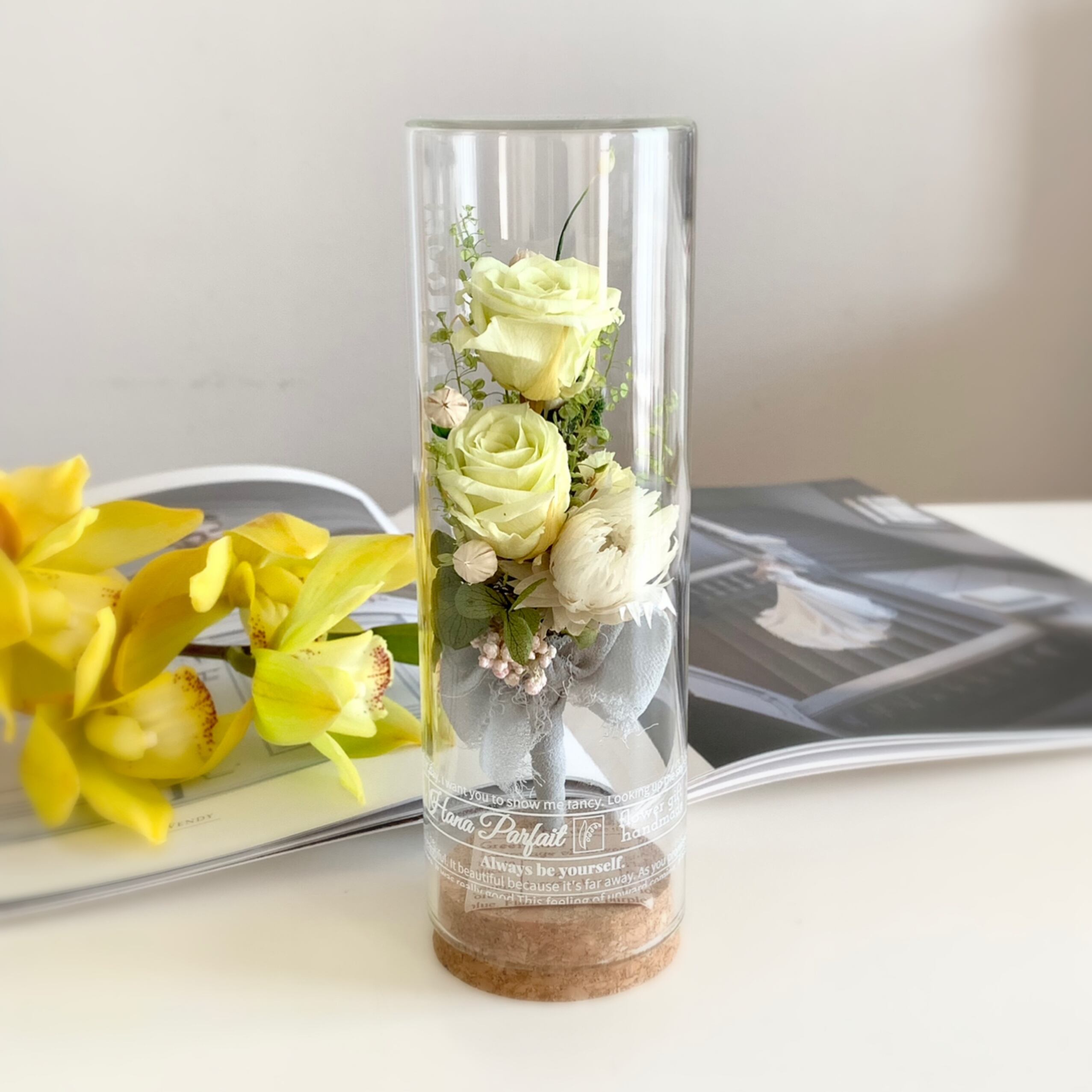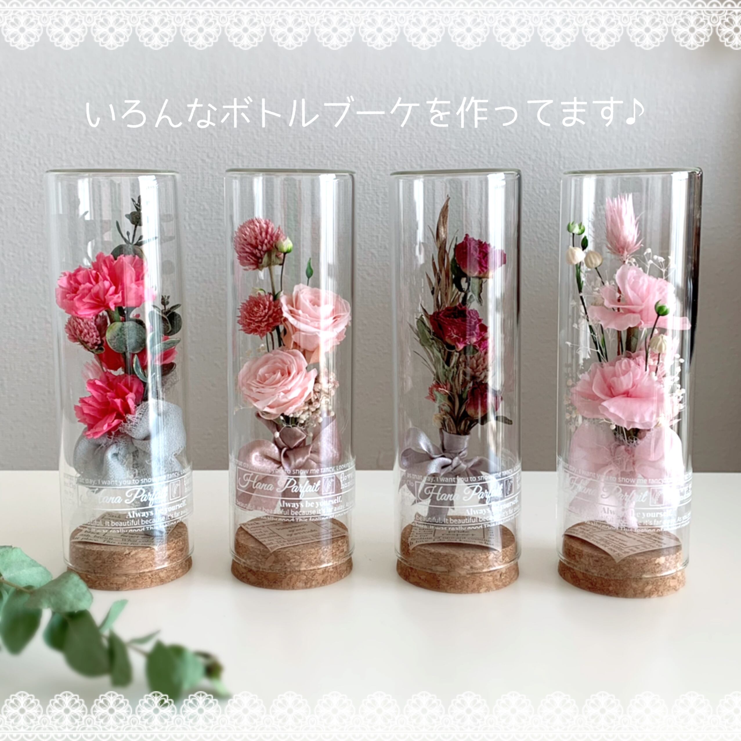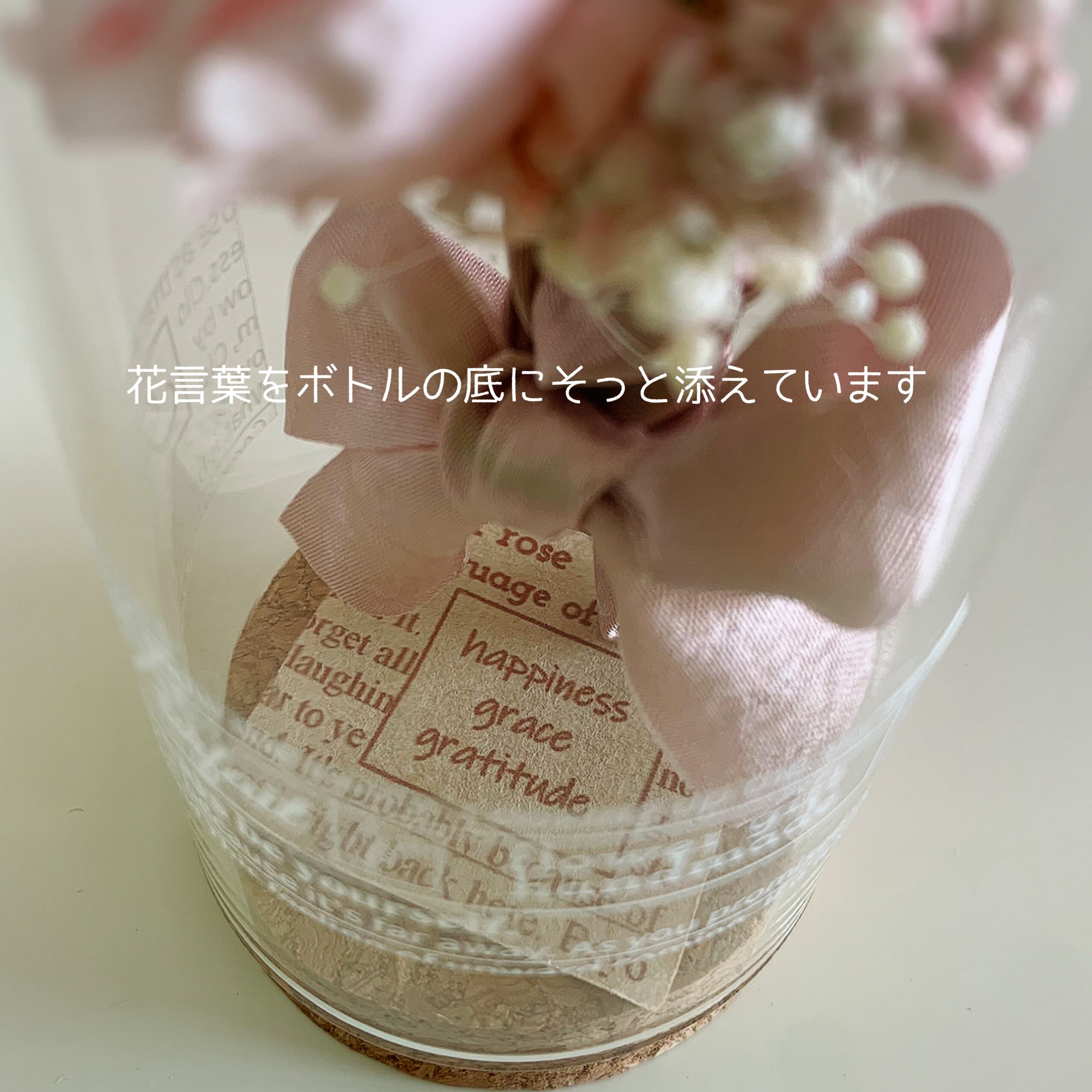 プリザーブドフラワーやドライフラワーを使用していますので、お水換えなどのお世話は一切不要。ガラスのボトルに入っているので、お花や葉に埃がたまらず、虫が発生する心配もないので、清潔に美しい状態を保つことができます。